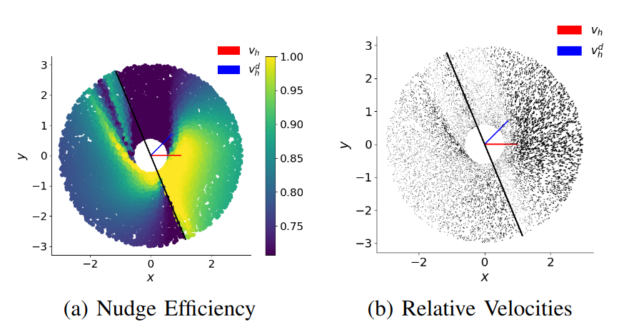 Through simulations, we compute the “nudge efficiency” metric, which showed that the best way to nudge an agent in a desired direction is to “lead” them towards that direction. The figure below shows this nudge efficiency metric around the target agent.